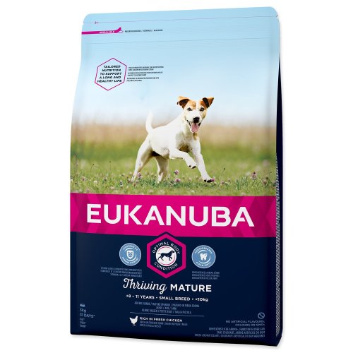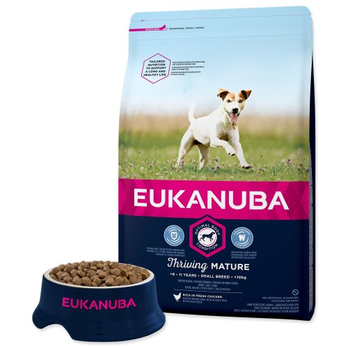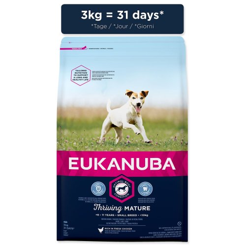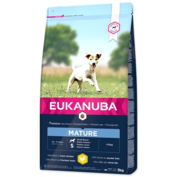 Nová EUKANUBA vylepšená receptúra so zameraním na konkrétnu fázu života - pre starších psov malých plemien od 8 do 11 rokov - poskytuje na mieru upravenú výživu pre zdravé starnutie vášho staršieho psa. Naša jedinečná na mieru upravená receptúra pre malé staršie psy obsahuje zmes vlákniny, prebiotiká FOS a repné dužiny pre podporu zdravého zažívania, vápnik pre zdravé kosti, glukosamín pre zdravé kĺby, prirodzený zdroj mastných kyselín omega-6 a omega-3 pre zdravú kožu a srsť, L-karni E a C na podporu imunitného systému. Naše unikátne granule v tvare šesťuholníka s prídavkom DentaDefense taktiež pomáhajú s udržiavaním čistých a zdravých zubov. Pokročilá výživa pre malé staršie psy so zameraním na podporu optimálneho telesného stavu a celoživotnú pohodu.