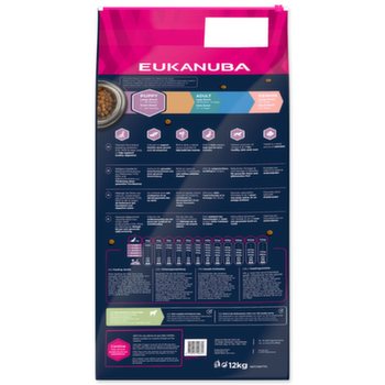 Jahňacie mäso predstavuje veľmi dobre stráviteľnú výživu, vhodnú aj pre citlivé psy . Táto strava od spoločnosti Eukanuba šteňatám poskytuje všetky živiny, dôležité vitamíny a minerály potrebné na optimálny rast. Obsahuje prísady vysokej kvality a veľké množstvo živočíšnych proteínov. 100% kompletná a vyvážená výživa pre šteňatá všetkých plemien uprednostňujúce krmivo s jahňacím mäsom pre ľahké trávenie a vynikajúci stav pokožky a srsti.