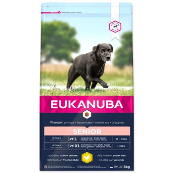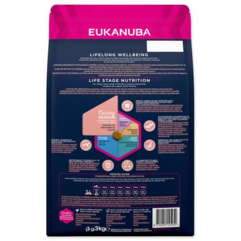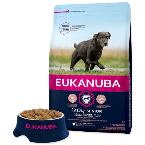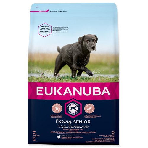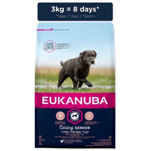 Nová EUKANUBA vylepšená receptúra so zameraním na konkrétnu fázu života - pre psích seniorov veľkých plemien nad 9 rokov - poskytuje na mieru upravenú výživu na podporu pohyblivosti a optimálneho telesného stavu vášho psieho seniora. Naša jedinečná na mieru upravená receptúra pre veľkých psích seniorov obsahuje zmes vlákniny, prebiotiká FOS a repné dužiny pre podporu zdravého zažívania, vápnik pre zdravé kosti, glukosamín a chondroitín pre zdravé kĺby, prirodzený zdroj mastných kyselín omega-6 a omega-3 pre zdravú kožu váhy a antioxidanty, vitamín E a C na podporu imunitného systému. Naše unikátne granule v tvare šesťuholníka s prídavkom DentaDefense taktiež pomáhajú s udržiavaním čistých a zdravých zubov. Pokročilá výživa pre veľkých psích seniorov so zameraním na podporu optimálneho telesného stavu a celoživotnú pohodu.