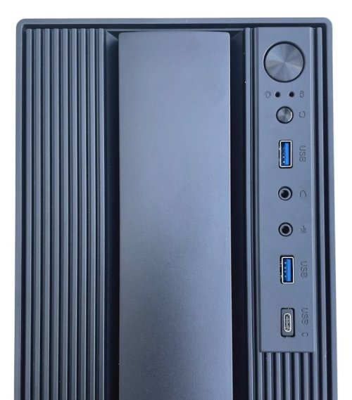 Konektory na prednom paneli: 2× USB 3.0, 1× USB-C, 1× slúchadlový výstup, 1× vstup pre mikrofón