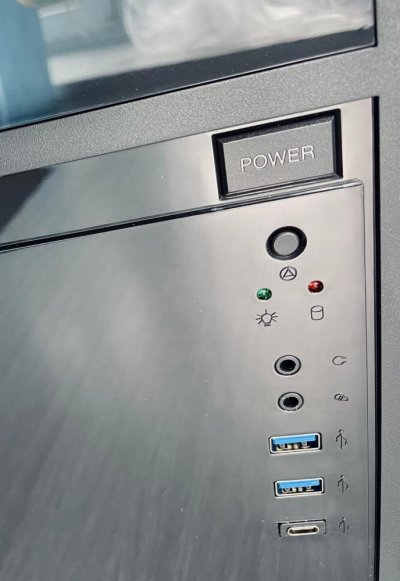 Konektory na prednom paneli: 2× USB 3.0, 1× USB-C, 1× slúchadlový výstup, 1× vstup pre mikrofón