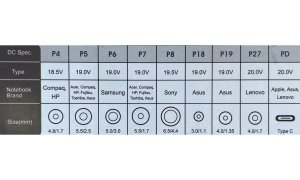 Balenie obsahuje koncovky P4 až P36 s rôznymi rozmermi a výstupnými napätiami. Koncovka P4 (4,8 × 1,7 mm) poskytuje 18,5 V pre Compaq a HP, zatiaľ čo najbežnejší P5 (5,5 × 2,5 mm) dodáva 19 V pre širokú škálu značiek.