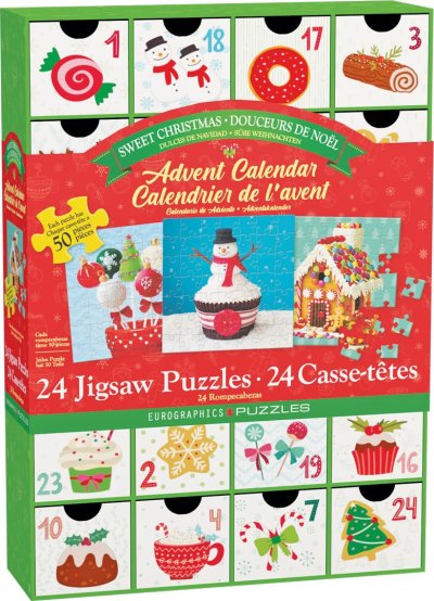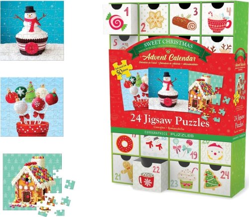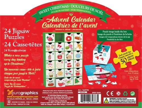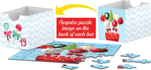 kalendár obsahuje 24 rôznych puzzle obrázkov s motívom sladkostí a cukroviniek každé puzzle má 50 dielikov obrázky majú štvorcový tvar a rozmer jedného puzzle je 12,5 x 12,5 cm kalendár obsahuje 24 šuplíkov a je znovu použiteľný (na budúci rok si s jeho pomocou môžete vytvoriť originálny adventný kalendár naplnený drobnosťami alebo niečím sladkým) rozmer priehradky je cca 6,5 x 6 x 7,5 cm vzadu v každom šuplíku je vyobrazená predloha skladaného obrázku