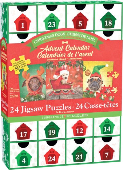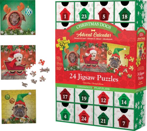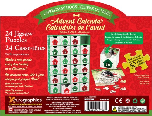 kalendár obsahuje 24 rôznych puzzle obrázkov s motívom vianočných psov každé puzzle má 50 dielikov obrázky majú štvorcový tvar a rozmer jedného puzzle je 12,5 x 12,5 cm kalendár obsahuje 24 šuplíkov a je znovu použiteľný (na budúci rok si s jeho pomocou môžete vytvoriť originálny adventný kalendár naplnený drobnosťami alebo niečím sladkým) rozmer priehradky je cca 6,5 x 6 x 7,5 cm vzadu v každom šuplíku je vyobrazená predloha skladaného obrázku