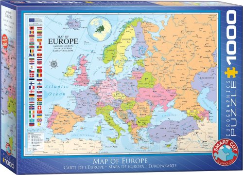 Puzzle Mapa Európy je výzvou pre každého milovníka puzzle. Na svoje si prídu aj priaznivci zemepisu a kartografie. Na mape sú farebne odlíšené jednotlivé štáty. Okrem iného sú tu vyznačené aj hlavné a väčšie mestá všetkých vyobrazených krajín spolu s popisom morí a oceánov.