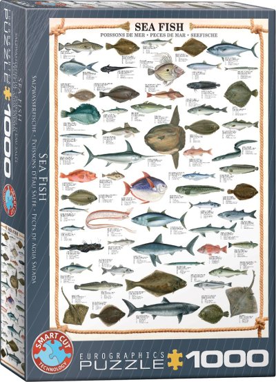 Puzzle zobrazuje najznámejšie druhy morských rýb. Pri každej rybe je uvedený názov, hmotnosť a dĺžka.