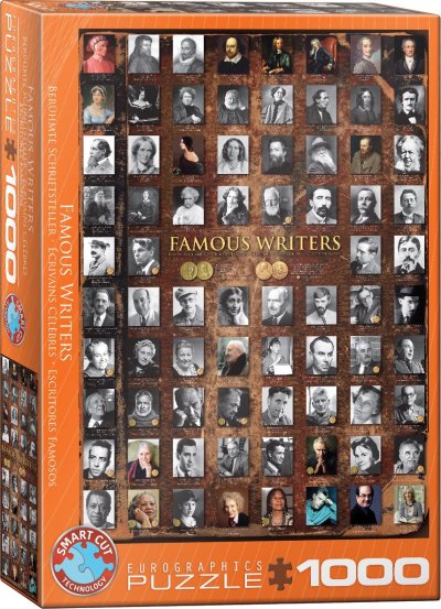 Puzzle EUROGRAPHICS s obrázkami najslávnejších spisovateľov od 14. storočia až po súčasnosť. Pri fotografii je uvedené meno, dátum narodenia a úmrtia, najslávnejšie autorovo dielo a ocenenie ( Pulitzerova cena, Nobelova cena za literatúru). Popisky sú uvedené v anglickom jazyku.