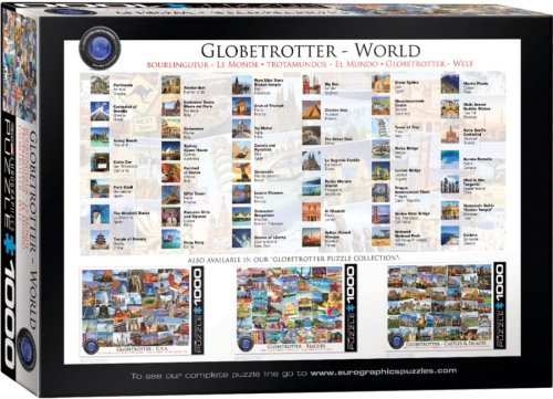 Puzzle EUROGRAPHICS z kolekcie Globetrotter Collection (Svetobežník). Viac ako 40 najznámejších miest celého sveta s podrobným popisom na zadnej strane krabičky (v angličtine).