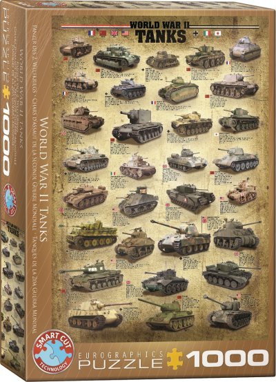 Puzzle predstavuje tanky 2. svetovej vojny. Pri každom tanku je uvedené jeho meno, krajina pôvodu, typ, ako dlho bol v prevádzke, hmotnosť, dĺžka, šírka, výška, ale aj rýchlosť na ceste alebo koľkú člennú posádku mohol tank mať. Raznice puzzle EUROGRAPHICS nekopíruje štandardnú mriežku, rohy a hrany dielikov nie sú vždy v jednej osi a dieliky majú neobvyklý tvar. Obtiažnosť puzzle je tak vyššia ako pri klasickej mriežkovej raznici, ktorú používajú poprední výrobcovia v Európe. Rozmer zloženého puzzle cca 48,89 x 67,63 cm