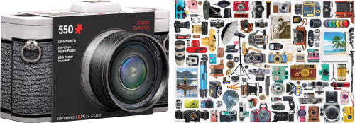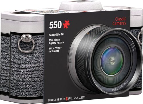 Puzzle v plechovej krabičke v tvare striebročierneho klasického fotoaparátu. Zberateľská kolekcia poteší všetkých milovníkov plechových krabičiek s potlačou a obal na puzzle sa tak stáva zaujímavou a nevšednou dekoráciou. Hornú časť fotoaparátu tvorí veko krabičky a je odnímateľná. Súčasťou balenia je aj samostatná predloha s motívom na skladanie. Dieliky majú špeciálny tvar (nekopírujú klasickú puzzle raznicu). Rozmer zloženého puzzle cca 48 x 33 cm