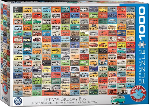 Puzzle VW Groovy Bus je koláž fotografií nemeckých áut značky Volkswagen. Medzi obrázkami nechýba ani bus ozdobený kvetmi, predsa len tento model preslávili najviac práve kvetinové deti (hippies).