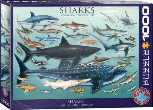 Puzzle s vyobrazením najznámejších druhov žralokov. Pri každom obrázku je uvedený anglický a latinský názov a veľkosť žraloka v palcoch av zátvorke potom aj v centimetroch.