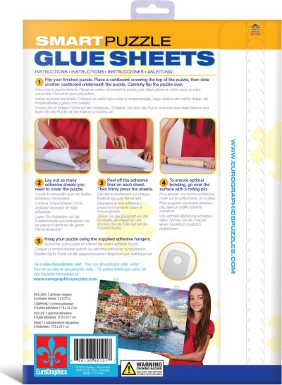 Sada samolepiacej fólie s dvoma háčikmi pre ľahké a rýchle vystavenie vášho puzzle. Výrobok obsahuje: 8 listov fólie, každý o rozmere 17,8 x 24,7 cm (celková plocha max. 68 x 48 cm) 2 úchyty na zavesenie obrázku na stenu Návod na použitie: Zložené puzzle položte obrázkom dole a na jeho zadnú stranu si rozložte fólie Smart Puzzle Glue Sheets tak, aby presahovali cez seba aspoň 1cm. Fóliu je možné strihať nožnicami. Akonáhle je pokrytý celý obrázok, odlepte z hárkov fólie kryciu vrstvu a nalepte fóliu na vybrané miesto. Po aplikácii všetkých lepiacich fólií ich pevne pritlačte, prípadne na tento účel použite valček na cesto alebo prázdnu fľašu. Na zvolené miesto prilepte háčiky na zavesenie. Ilustračné video Smart Puzzle Glue Sheets Rozmer zloženého puzzle cca 68 x 48 cm