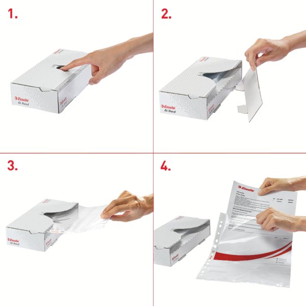 Závesné obaly „U” v praktickom balení v kartónovej krabičke; jednoduchá manipulácia s jednotlivými obalmi; krabičku je možné umiestniť zvisle aj vodorovne; hore otvorené; europerforácia