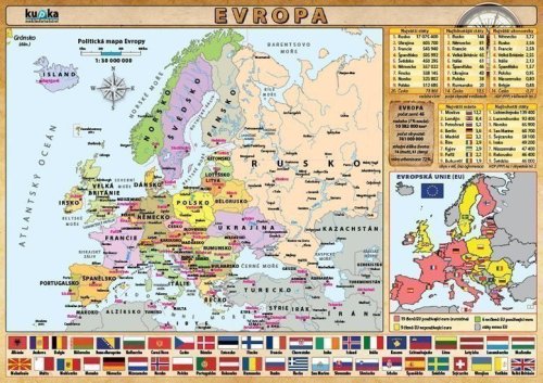 Politická a fyzická mapa Európy vrátane mapy Európskej únie. Obsahuje štátne vlajky európskych krajín, tabuľky s poradím štátov podľa rôznych kritérií a tabuľku zemepisných rekordov.