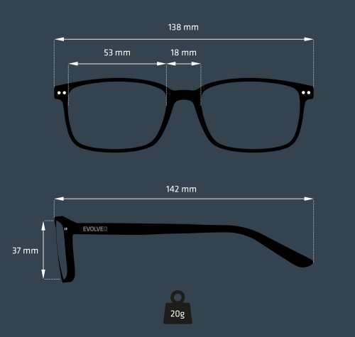 Rozmery okuliarov: 1) Celková šírka: 138 mm 2) Šírka očnice: 53 mm 3) Výška očnice: 37 mm 4) Dĺžka stranice: 142 mm 5) Šírka nosníka: 1 okuliarov: čierna • Farba šošoviek: jantárovo žltá