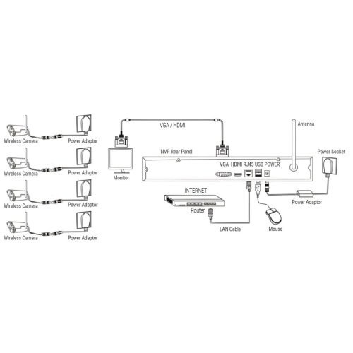 • NVR jednotka s 8 kanálmi, SATA pripojením pre až 8TB disk • 4x Bezdrôtová Bullet IP66 kamera s nočným prísvitom • 4x Anténa pre bezdrôtovú kameru 2,4G 5db • 1x napájací adaptér DC 12V 2A pre NVR • 4x napájací adaptér pre kamery pre upevnenie kamery • 4x bajonetová tesniaca krytka pre RJ45 konektor • 1x Anténa pre NVR jednotku • 1xUSB myš • 1xSATA kábel na pripojenie HDD • 1x Užívateľský manuál