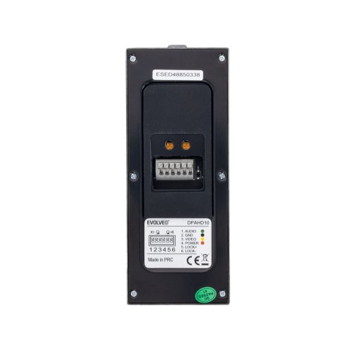 Vonkajšia jednotka: Rozlíšenie kamery: 2MPx 1080P Video stream: H.264 Uhol snímania: 120° Komunikácia: Obojsmerná Funkcia: Volanie a komunikácia Doba hovoru: 60 sekúnd Vodotesnosť: IP65 (pri správnej inštalácii s tesnením) Nočné videnie: Áno Pohotovosť DC/1A Pracovná teplota: -10°C až +60°C Pripojenie: 4 vodiče Podpora zámkov: Možnosť pripojenia až 2 zámkov, nutnosť externého napájania pre elektromagnetický zámok Rozmery: 159 x 68 x 31 mm Váha: 1025g ( 720 g ID karta RFID Frekvencia: 125 kHZ Tlačidlá: 1 tlačidlo pre volanie na monitor Ďalšia výbava jednotky: Mikrofón, reproduktor, infračervené prísvetlenie pre nočné videnie