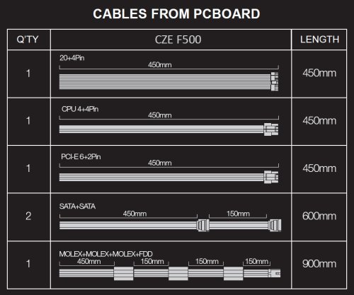 Kabeláž • 1x MB 20 + 4 pin 450 mm • 1 x cpu 4 pin (8 pin - 4 + 4) 450 mm • 1 x VGA PCI-E 6 + 2 pin 450 mm S-ATA150mm • čierna farba