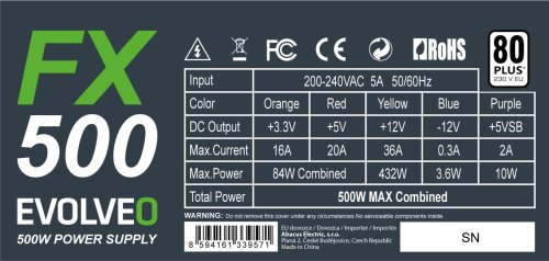 Špecifikácia • Ventilátor 14 cm, zelený • Aktívny PFC • Certifikácia 80+ • Účinnosť minimálne 82%/85%/82% pri zaťažení 20%/50%/100% • Ochrana proti skratu, preťaženiu, prepätiu a podpätiu