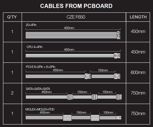 Kabeláž • 20+4 Pin (450mm) • CPU 4+4 pin (450mm) • PCI-E (6+2) + (6+2)pin (450+150mm) • Sata+Sata+Sata (450+150+150mm) • Sata+Sata+Sata (450+150) (450+150+150mm) • čierna farba