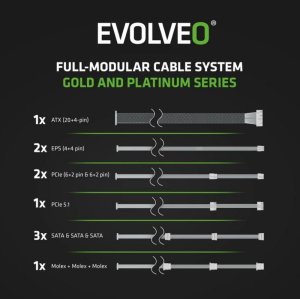 PC zdroj EVOLVEO P1200-BK je hrdým držiteľom certifikácie 80 PLUS Platinum, ktorá sľubuje až 94% účinnosť (pri bežnom 50% zaťažení). Minimálne straty energie a nízke zahrievanie idú pritom ruka v ruke s tichým chodom 140mm HDB ventilátora – ten má medzi hriadeľom a ložiskami špeciálnu olejovú vrstvu a jeho trenie je nepatrné, takže hlučnosť zostáva na minime. S týmto zdrojom vás skrátka hučanie ventilátora neruší - počuť ich len svišťanie kolies vašej formule alebo rinčanie zbraní vašej armády.