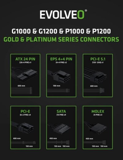 Zabudnite na zamotané káble, ktoré bránia prúdeniu vzduchu a ešte vašej počítačovej skrini kazia štýl. Zdroj EVOLVEO P1200-BK je plne modulárny, takže k nemu pripojíte len tie káble, ktoré skutočne potrebujete. Súčasťou balenia sú všetky dôležité šnúry – jeden kábel ATX 24 PIN, dva EPS 4+4 PIN, dva PCI-E 6+2 PIN, jeden PCI-E 5.1 12V-2×6, tri SATA a jeden MOLEX. Vďaka tomu máte miesto na všetko od CPU a GPU cez disky až po vymazané LED pásky či iné extra prvky.
