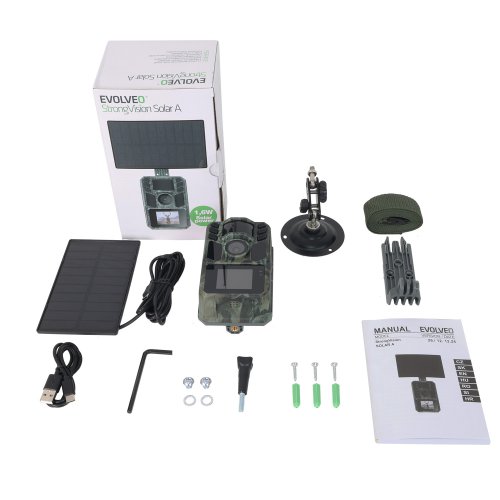 Obsah balenia: Fotopasca EVOLVEO StrongVision SOLAR WiFi Solárny panel (1,6 W) USB-C kábel (napájací a dátový) Držiak solárneho panelu Držiak so závitom pre fotopascu Montážne skrutky Upevňovací pásik Užívateľský manuál (CZ,SK,EN,HU,RO,Si,HR)