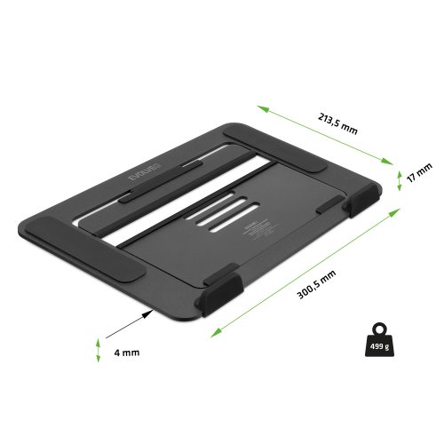 • Univerzálna konštrukcia pre notebooky a tablety až do 16" • Pasívny systém chladenia s efektívnym odvodom tepla a optimalizovanou cirkuláciou vzduchu • Extra veľký chladiaci otvor 22 × 16,1 cm • Výškovo polohovateľný do 3 uhlov (22°/30°/40°) • Ultraľahká konštrukcia z odľahčeného 1) Garantuje torznú stabilitu 2) 100% odolná proti korózii 3) Dlhá životnosť • Skladacia konštrukcia ideálna pre jednoduchý a komfortný prenos • Silikónové opierky pre spodnú hranu notebooku (šírka 4,6 cm) zabraňujú: 1) Poškriabaniu notebooku 2) Nechcenému skĺznutiu pri manipulácii bloky eliminujúce poškriabanie spodnej časti notebooku • Protišmykové silikónové pätky výklopnej časti pre maximálnu stabilitu na stole • Ultraslim prevedenie (výška v zloženom stave iba 4 mm bez opierok) • Ergonomicky polohovateľná konštrukcia garantuje: 1) Správne držanie tela 2) Zmiernenie bolesti chrbta a 2 zaisťuje: 1) Vynikajúcu cirkuláciu vzduchu 2) Odvod tepla 3) Stabilnú teplotu notebooku • Materiál: hliník + silikón • Hrúbka hliníka: 3,75 mm • Nosnosť: 10 kg • Výška vrátane zarážok: 17 mm • Rozmery (š × h × v): 300,5 × 4 × 4 OBSAH BALENIA: