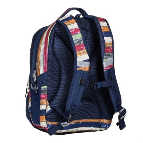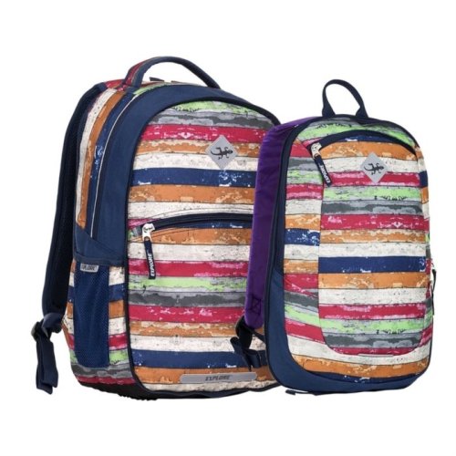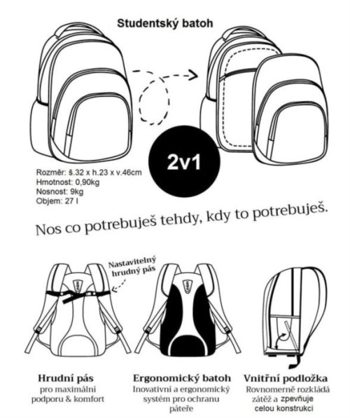 Študentský batoh 2v1 VIKY je dvojdielny a trojkomorový. Dvojdielny (2v1) znamená, že zips pri prostrednej komore ide buď úplne rozopnúť a tým sa rozdelí batoh na dva. Alebo sa rozopne len čiastočne a slúži ako plnohodnotný trojkomorový plecniak. Väčší batoh má chrbtovú časť s polstrovaním a ergonomickým systémom na ochranu chrbtice. Široké nosné remene sú opatrené výškovo nastaviteľným spojovacím prsným pásikom. Dno plecniaka má vnútornú podložku, ktorá spevní jeho celkovú konštrukciu a zaistí stabilitu plecniaka pri jeho postavení na zem. Na prednom dieli je potom veľké vrecko na zips. Menší batoh, má organizér našitý na veľkom vnútornom vrecku. Organizér tvorí vrecko na mobil, vrecko na zips a miesto na písacie potreby. V hornej časti je upevnená karabínka na kľúče. Na prednom diele batohu je vrecko na zips. Chrbtová časť je polstrovaná v celej ploche. Batoh má dve sieťované voľne prístupné bočné vrecká v hornom okraji so všitou gumou. Reflexné prvky sú ako na prednom dieli, tak aj na nosných remeňoch.