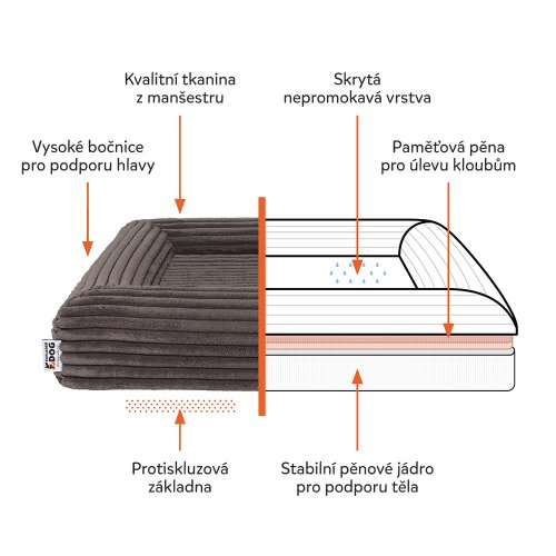 Jadro pelechu tvorí 5 cm vysoká polyuretánová pena (PUR) o hustote 25D, ktorá slúži ako pevná a odolná základňa. Na nej leží 2 cm pamäťovej peny o hustote 40D, ktorá sa prispôsobí tvaru tela psa, rovnomerne rozloží tlak a uľaví kĺbom aj chrbtici. Celková výška matraca je 7 cm, čo zaisťuje pohodlie bez prehnaného prepadania a súčasne uľahčuje pohyb v pelechu. Bočnice vysoké 15 cm tvoria prirodzenú oporu hlavy a zároveň pomáhajú vytvoriť chránený a útulný priestor. Pes sa tak môže ľahko uvoľniť a nerušene odpočívať, bez stresu a vyrušenia.