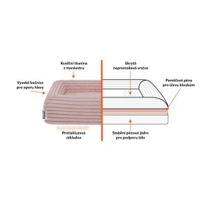 Jadro pelechu tvorí 4 cm vysoká polyuretánová pena (PUR) o hustote 25D, ktorá slúži ako pevná a odolná základňa. Na nej leží 2 cm pamäťovej peny o hustote 40D, ktorá sa prispôsobí tvaru tela psa, rovnomerne rozloží tlak a uľaví kĺbom aj chrbtici. Celková výška matraca je 6 cm, čo zaisťuje pohodlie bez prehnaného prepadania a súčasne uľahčuje pohyb v pelechu. Bočnice vysoké 13 cm tvoria prirodzenú oporu hlavy a zároveň pomáhajú vytvoriť chránený a útulný priestor. Pes sa tak môže ľahko uvoľniť a nerušene odpočívať, bez stresu a vyrušenia.