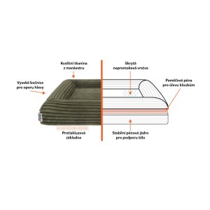 Jadro pelechu tvorí 4 cm vysoká polyuretánová pena (PUR) o hustote 25D, ktorá slúži ako pevná a odolná základňa. Na nej leží 2 cm pamäťovej peny o hustote 40D, ktorá sa prispôsobí tvaru tela psa, rovnomerne rozloží tlak a uľaví kĺbom aj chrbtici. Celková výška matraca je 6 cm, čo zaisťuje pohodlie bez prehnaného prepadania a súčasne uľahčuje pohyb v pelechu. Bočnice vysoké 13 cm tvoria prirodzenú oporu hlavy a zároveň pomáhajú vytvoriť chránený a útulný priestor. Pes sa tak môže ľahko uvoľniť a nerušene odpočívať, bez stresu a vyrušenia.