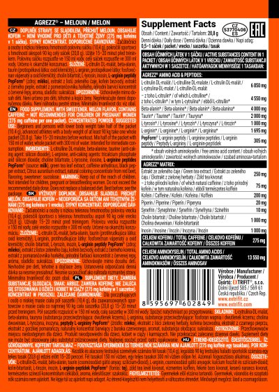 Celkom 8 850 mg pumpovacích látok: citrulín DL-malát, arginín a prémiová zložka PepForm® Arginine Peptides – mimoriadne silný arginín v peptidovej forme! Jedná sa o unikátnu zložku, ktorú používajú len tie najdrahšie a najlepšie produkty na trhu! Aminokyselina beta-alanín v ohromnej dávke 4 000 mg pre maximálnu výdrž svalov. Aminokyselina tyrozín v dávke 1 000 mg na dosiahnutie optimálneho fyzického a mentálneho výkonu. Kofeín, taurín a extrakt zeleného čaju podporia sústredenie na výkon, nakopnú a oddialia pocit únavy. Vy tak budete môcť efektívne trénovať dlhšiu dobu ako normálne! Inosin: moderná predtréningová látka, ktorú nájdete len v tých najpokročilejších produktoch. Piperín (extrakt z korenia): veľmi cenená látka s radom pozitívnych účinkov na zdravie - podporuje imunitu, činnosť pečene, krvný obeh v malých cievach a maximalizuje účinky ostatných látok v produkte. Cholín a synefrín (extrakt z pomarančovníka) prispievajú k využitiu tukov v energetickom metabolizme. Na svoje si tak prídu aj športovci v rysovacej fáze a tí, ktorí si strážia telesnú hmotnosť. Extra silný pre-workout vhodný aj do diéty Veľkou výhodou produktu je nulový obsah sacharidov a tuku. Produkt je tak vhodný aj pre športovcov vo fáze rysovania. Navyše vďaka účinným látkam, ako sú zelený čaj, piperín alebo cholín, podporuje AGREZZ® efektívny metabolizmus tukov. Tento produkt je určený pre náročných športovcov. Zažijete novú dimenziu tréningu! Je to skutočne silný produkt, dodržujte teda odporúčané dávkovanie a neužívajte ho krátko pred spánkom. Je taký silný, že jeho účinok by mohol pretrvávať aj v čase, keď už potrebujete regenerovať. Dokonalá chuť v praktickom balení Väčšina pre-workoutov nechutí dobre, to ale nie je prípad produktu AGREZZ®! Vďaka mnohoročným skúsenostiam s ochucovaním suplementov sme všetky príchute vyladili k absolútnej dokonalosti. Vzhľadom na vysoký obsah a typ účinných látok sa tak jedná o úplný unikát! A aby ste nemuseli odsypávať prášok z veľkého balenia, Extrifit® pre Vás pripravil produkt vo vrecúškach, v ktorých je dávka úplne presne odmeraná. Vrecko je malé, praktické a môžete ho vziať so sebou kamkoľvek. V prípade potreby stačí rozpustiť vo vode a nápoj je hotový!