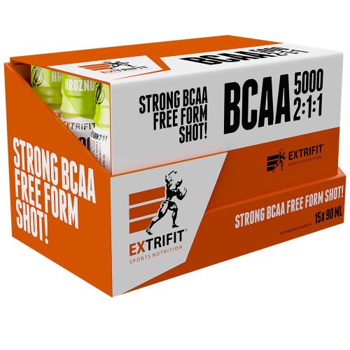 BCAA 5000 MG je doplnok stravy od firmy Extrifit obsahujúci tekuté voľné vetvené aminokyseliny leucín, izoleucín a valín vo forme „shotu“ – nápoje určeného na jednorazovú konzumáciu. Hotová tekutka! Nič nemusíš miešať! Hoď to do seba a choď na to! Tieto BCAA majú 5000 mg v jednej fľaštičke! (nie 3000, ako ostatní…!) BCAA sú základným stavebným kameňom svalovej hmoty a prostriedkom na rast a regeneráciu. Základ suplementácie pre všetkých! BCAA – voľné vetvené aminokyseliny L-leucín, L-izoleucín a L-valín sa radia medzi esenciálne (nepostrádateľné) aminokyseliny a sú obsiahnuté priamo v svalovom tkanive, kde môžu byť využité ako dôležitý zdroj energie pre svalovú prácu. Vetvené aminokyseliny sú obsiahnuté v strave, sú teda látkou ľudskému telu úplne prirodzenou. Vetvené aminokyseliny leucín, izoleucín a valín sú v športovej výžive považované za suplement, o ktorého účinku už nikto nepochybuje. Užívajú ich športovci všetkých športových disciplín. Niektorí pre nárast čistej svalovej hmoty, niektorí pre jej ochranu pred katabolizáciou a iní pre rýchlu a efektívnu regeneráciu. Pre účinok BCAA je kľúčové SPRÁVNE NAČASOVANIE ich príjmu a tiež FORMA, v akej BCAA prijmete. Je možné užívať BCAA aj v priebehu dňa, napríklad pri rysovaní, základné užívanie je ale v čase okolo tréningu. A vtedy potrebujete takú formu BCAA, ktorá sa čo najrýchlejšie vstrebe a taktiež nebude zaťažovať váš tráviaci trakt. To vám môže ponúknuť tento náš produkt. Jeden shot obsahuje celých 5000 mg čistých BCAA! Odporúčané dávkovanie: