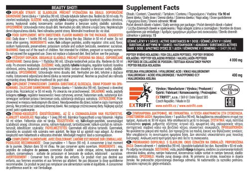1× denne kedykoľvek. Hodí sa ráno, do práce, po tréningu aj večer. Pre jemnejšiu chuť zrieď do 50 ml vody. Pre koho Ideálne pre ženy aj mužov. Od bežného dňa v kancelárii až po súťažnú scénu. Skrátka pre každého, kto chce starostlivosť o vzhľad riešiť rýchlo, ľahko a chutne. Shoty EXTRIFIT® – česká výroba Naše zhoty vyrábame pod jednou strechou v Dolnom Újezde: vlastný vývoj, vlastné technológie, naša zodpovednosť za každý mililiter. Celý proces držíme pevne v rukách - od výberu tých najlepších surovín, cez testovanie a miešanie, až po balenie a expedíciu. Každú šaržu si strážime sami. Žiadne anonymné fabriky, žiadny outsourcing. Len precízna výroba a výsledok, na ktorý sa môžeš spoľahnúť. Odporúčané dávkovanie: