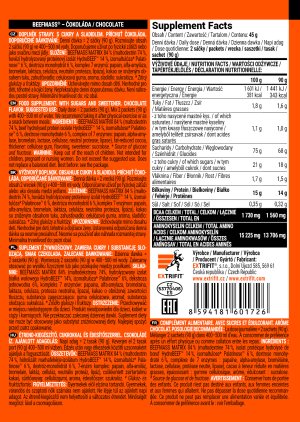 maltodextrín, HydroBEEF® - hovädzí hydrolyzovaný proteínový izolát (hydrolyzované hovädzie peptidy), dextróza, PalatinoseTM (izomaltulóza), enzýmy bromelain a papain prídavné látky: kakao odtučnené, aróma, xanthan a guma guar (stabiliz Upozornenie: Skladujte v suchu pri teplote do 25 ° C, starostlivo uzavreté. Po otvorení spotrebujte do troch mesiacov. Chráňte pred mrazom a priamym slnečným žiarením. Neobsahuje látky dopingového charakteru. Nie je určené pre deti, tehotné a dojčiace ženy. Výrobca neručí za škody, vzniknuté nevhodným použitím alebo skladovaním. Spotrebujte do dátumu uvedeného na obale. Upozornenie pre alergikov: výrobok obsahuje bielkoviny z kravského mlieka vrátane laktózy.