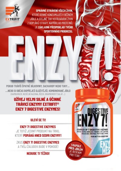S doplnkom Enzy 7! Digestive Enzymes využijete dokonale každú živinu. A to nielen z bežného jedla, ale aj zo suplementov, akými sú napríklad Vaše obľúbené proteínové nápoje alebo rôzne instantné kaše (Protein Break!, Rice & Oat Mash ai.) U športovcov má zhoršené trávenie negatívny vplyv na športový výkon aj následnú regeneráciu. Športovci nutne potrebujú telu zaistiť dostatočný príjem žiaducich živín. Preto je pri nízkej produkcii enzýmov užívanie produktu Enzy 7! Digestive Enzymes veľmi efektívnym riešením. Produkt je vhodné užívať pred konzumáciou väčších porcií s kombinovaným zastúpením bielkovín, sacharidov, tukov a vlákniny. Pomôže Vám aj s trávením veľmi zložitých jedál, ako je občasná nedeľná kačica či rezeň so zemiakovým šalátom. Teda nielen pri diétnej strave. Enzy 7! Digestive Enzymes je naplnený v kapsuliach, ktoré sa rýchlo a dobre trávia, čo je pre ich účinok veľmi dôležité. Enzýmy sú v originálnych kapsuliach s logom Extrifit®. Logo je vytlačené prírodným farbivom. Odporúčané dávkovanie: