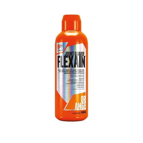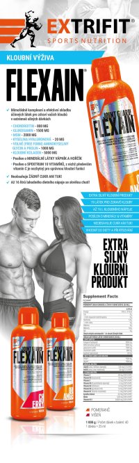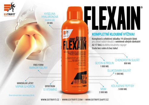 19 účinných látok! masívne množstvo kĺbových ingrediencií v každej dennej dávke extrémna dávka chondroprotektív: kyselina hyalurónová, chondroitín, glukosamín, MSM, hydrolyzované kolagénne peptidy kĺbovej aminokyseliny Prolín a Glycín vo voľnej forme (RHP) obsahuje 10 dôležitých vitamínov – všetky nastavené na 100% dennej odporúčanej dávky (RHP) tekutá forma zaisťuje vynikajúcu vstrebateľnosť a využiteľnosť bez chemických farbív žiadny cukor! žiadny tuk! 40 dávok v jedinej fľaši mimoriadne lahodný nápoj s ovocnými príchuťami vhodný aj pri najprísnejšej diéte! Flexain® vo forme koncentrátu je veľmi vhodný aj pre osoby, ktoré zabúdajú pravidelne piť. Jednu dávku produktu Flexain® (25 ml) si rozriedite na 400 ml vody. Tým vznikne vynikajúci drink a hneď viete, že ste urobili správnu vec ako pre vaše kĺby, tak aj pre váš pitný režim. Flexain® je určený aj pre náročných športovcov, preto obsahuje vysoké dávky tých najdôležitejších chondroprotektív v unikátnej kombinácii. To všetko nie v obrých tabletách, ale vo forme lahodného nápoja, ktorý chutí ako skutočná ovocná šťava! Vďaka tejto tekutej forme sa všetky účinné látky rýchlejšie vstrebajú. K zvýšenej záťaži kĺbov dochádza ako pri silovom tréningu, tak pri vytrvalostných športoch, Flexain® je teda vhodný pre široké spektrum športovcov. Z jedného balenia pripravíte až 17 litrov nápoja! Flexain® je obohatený o silný komplex vitamínov, z ktorých predovšetkým vitamín C prispieva k normálnej tvorbe kolagénu v krvných cievach, chrupavkách a kostiach. Veľkou výhodou produktu je to, že má nulový obsah tuku a cukrov, je tak možné ho používať aj pri prísnej redukčnej diéte a pri rysovaní svalov! Odporúčané dávkovanie: