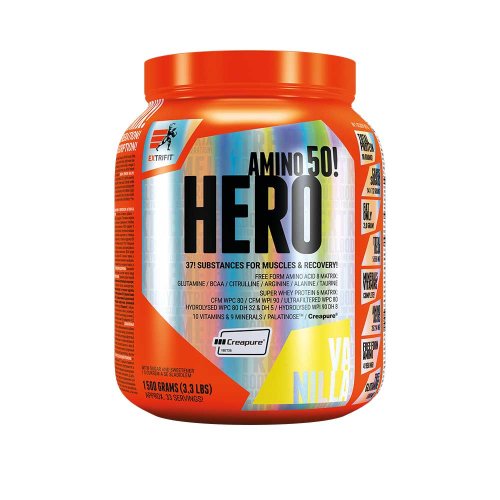 vitamín B1 - 1,2 mg/100 g (111% RHP) - prispieva k normálnemu energetickému metabolizmu, prispieva k normálnemu energetickému metabolizmu, k normálnej činnosti nervovej sústavy, k činnosti srdca ak normálnej psychickej činnosti. únavy a vyčerpanie ak ochrane buniek pred oxidatívnym stresom vitamín B3 - 17,8 mg/100 g (111% RHP) - prispieva k normálnemu energetickému metabolizmu, k normálnej činnosti nervovej sústavy, k zníženiu miery únavy a vyčerpania ak normálnej psychickej činnosti vita0 B - prispieva k normálnemu energetickému metabolizmu, k normálnej syntéze metabolizmu steroidných hormónov, vitamínu D a niektorých neurotransmiterov, prispieva k zníženiu miery únavy a vyčerpania ak normálnej mentálnej činnosti vitamín B6 - 1,6 mg/100 g (111% RHPI) - prispieva bielkovín a glykogénu, k normálnej činnosti nervovej sústavy, k regulácii hormonálnej aktivity, prispieva k normálnej funkcii imunitného systému, k zníženiu miery únavy a vyčerpania ak normálnej psychickej činnosti biotín - 0,06 mg/100 g (111% RHP) - prispieva k normálnemu energetickému metabolizmu, k normálnemu energetickému metabolizmu makroživín a na normálnu psychickú činnosť kyselina listová - 0,22 mg/100 g (111% RHP) - prispieva k normálnej syntéze aminokyselín, k normálnej krvotvorbe, k normálnej funkcii imunitného systému, k zníženiu miery únavy a vyčerpania ak normálnej psychickej činnosti vitamín B12 - 1/0,0 prispieva k normálnemu energetickému metabolizmu, k normálnej činnosti nervovej sústavy, k normálnej psychickej činnosti, k normálnej funkcii imunitného systému ak zníženiu miery únavy a vyčerpaniu vitamínu C ciev, chrupaviek a kostí, prispieva k normálnemu energetickému metabolizmu, k normálnej činnosti nervovej sústavy, k normálnej psychickej činnosti, k normálnej funkcii imunitného systému, k ochrane buniek pred oxidatívnym stresom ak zníženiu miery únavy a vyčerpania vitamín E - 1s oxidatívnym stresom Vďaka obsahu proteínov prispieva Hero k rastu sily a svalovej hmoty ak jej udržaniu v situáciách, kedy je ohrozená katabolizáciou, ako je napríklad veľmi intenzívny či dlhotrvajúci tréning. Hero je skvelou investíciou! 37 všetkých účinných látok, nutných pre doplnenie po tréningu, neponúka žiadny iný produkt! Nie je potrebné nakupovať jednotlivé potréningové suplementy každý zvlášť! Extrifit Vám ponúka Hero vo viacerých výborných príchutiach. Pripravený nápoj má krémovú konzistenciu a skvelú chuť.