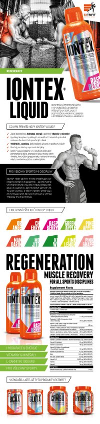 Iontex ® Liquid je univerzálny iontový športový nápoj výnimočne lahodnej chuti, ktorý môžete piť pri športových výkonoch rôzneho charakteru – ako pri cvičení vo fitness centre, tak pri vytrvalostnom tréningu či pri akejkoľvek inej pohybovej aktivite. Obzvlášť vhodný je pre tie športy, ktoré majú dlhšie trvanie alebo pri ktorých dochádza k väčším stratám tekutín potením. Iontex ® Liquid Vám zaistí dostatočnú hydratáciu, energiu a potrebné vitamíny a minerály! Iontex® Liquid obsahuje ako zdroj energie glukózo-fruktózový sirup doplnený o 1000 mg karnitínu, látku tradične užívanú v športovej výžive, a vyvážený komplex 6 potrebných minerálov a 10 vitamínov zostavený logicky podľa denných odporúčaných dávok (RHP). Iontex® Liquid Vám Extrifit ponúka v desiatich lahodných príchutiach: pomarančová šťava, ananásový džús, citrón-limetka, kivi, ružový grep, malinová limonáda, višňa a zelené jablko. Všetky chutia naozaj výborne! Iontex Liquid neobsahuje žiadne chemické farbivá, iba prírodné! Odporúčané dávkovanie: