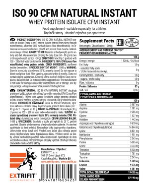 Iso 90 Natural obsahuje proteínový izolát získaný mikrofiltráciou srvátky metódou CFM (Cross Flow Microfiltered). Príjem tohto vysoko kvalitného zdroja proteínu prispieva k rastu svalovej hmoty ak jej udržaniu v situáciách, kedy je ohrozená katabolizáciou. Odporúčané dávkovanie:
