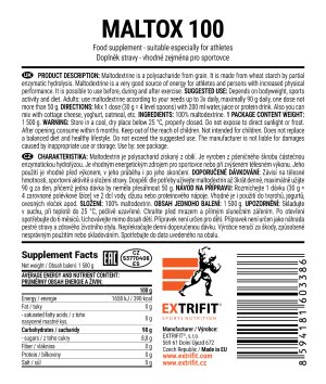 nie je sladký je okamžite rozpustný vďaka aglomerizácii je vynikajúcim zdrojom sacharidov pre športovcov a pre osoby pri zvýšenej telesnej záťaži Extrifit® Maltox 100 nepochádza z Číny. Pšenica (surovina na výrobu maltodextrínu) je vypestovaná v krajinách Európskej únie. Odporúčané dávkovanie: