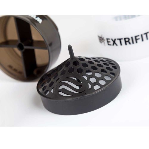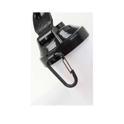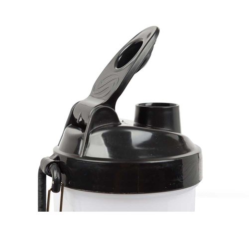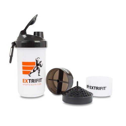 Jeden z odnímateľných zásobníkov obsahuje vloženú priehradku so štyrmi oddeleniami na tablety či kapsule, priehradku je možné ale aj vybrať, objem takto získaného priestoru (napr. na odsypanie proteínu alebo gaineru) je 150 ml. Druhý (spodný) zásobník má objem ďalších 200 ml. Samotný šejker má stupnicu od 100 do 600 ml. BPA a DEHP free.