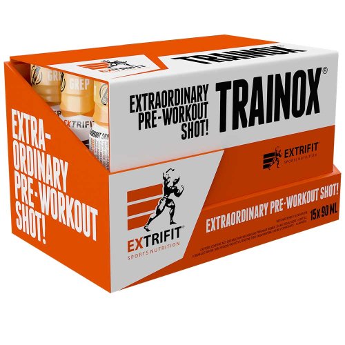 ! Obsahuje kofeín, nie je vhodné pre deti a tehotné ženy. Denná dávka (1 shot) obsahuje 310 mg kofeínu. Produkt nie je vhodný pre osoby trpiace precitlivenosťou na kofeín. TRAINOX® je doplnok stravy určený pre totálnu maximalizáciu tréningovej intenzity. Jedná sa o multikomponentný produkt obsahujúci úplne novú a brutálne silnú zmes účinných látok určených na predtréningové použitie. Poznáte AGREZZ®? Európsky hit a bestseller medzi pre-workouty? Máte ho v obľube? Tak TRAINOX® si zamilujete tiež. Ešte silnejšie zloženie a vďaka jednorazovým shotom pripravené rovno na konzumáciu! Tekutá forma produktu navyše zaisťuje rýchlu a výbornú vstrebateľnosť.