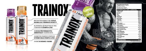 ! Obsahuje kofeín, nie je vhodné pre deti a tehotné ženy. Denná dávka (1 shot) obsahuje 310 mg kofeínu. Produkt nie je vhodný pre osoby trpiace precitlivenosťou na kofeín. TRAINOX® je doplnok stravy určený pre totálnu maximalizáciu tréningovej intenzity. Jedná sa o multikomponentný produkt obsahujúci úplne novú a brutálne silnú zmes účinných látok určených na predtréningové použitie. Poznáte AGREZZ®? Európsky hit a bestseller medzi pre-workouty? Máte ho v obľube? Tak TRAINOX® si zamilujete tiež. Ešte silnejšie zloženie a vďaka jednorazovým shotom pripravené rovno na konzumáciu! Tekutá forma produktu navyše zaisťuje rýchlu a výbornú vstrebateľnosť.