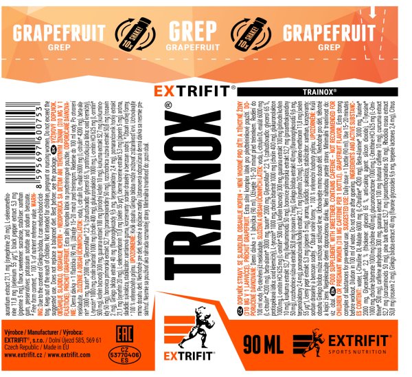 Podpora krvného obehu – poznáte ten pohľad do zrkadla na maximálne napumpované svalstvo po vyčerpávajúcej sérii? S produktom TRAINOX® si ho budete užívať ešte viac vďaka starostlivo vybranému extraktu z borovice prímorskej. Pridaný extrakt z Ginkgo biloba navyše zaistí, že aj v tých najmenších častiach svalových vlákien bude dosiahnutá plná dodávka krvi. Študenti a starší športovci tiež ocenia jeho preukázané účinky na kognitívnu (mozgovú) výkonnosť. Podpora výkonu - nechce sa vám na tréning po náročnom dni? Potrebujete zvýšiť fyzickú kapacitu* počas dlhých tréningov? Potom sa spoľahnite na obsiahnutý výťažok z guarany s 10% obsahom prírodného kofeínu a ďalších 300 mg kofeínu v čistej forme. Pripočítajte adaptogénne účinky extraktu z rozchodnice ružovej a vychádza jasný výsledok – enormných 310 mg kofeínu v každej dávke a pocit, že nasledujúca séria môže mať pokojne tisíc opakovaní! Podpora dýchacieho systému – vďaka extraktu z kurkumy budú pre vás akékoľvek supersérie, gigantické série, zhadzované série a ďalšie intenzifikačné techniky úplná hračka. Kontrola telesnej hmotnosti – extrakt z pomarančovníka horkého s vysokým obsahom synefrínu (95 %) naplno podporí vašu snahu o kontrolu telesnej váhy. Nenechajte sa ale zmiasť, TRAINOX® je vhodný nielen do redukčnej a udržiavacej fázy, ale vďaka dobre premyslenému zloženiu aj do tých najnáročnejších objemov! Antioxidačné účinky – náročná fyzická aktivita vytvára tzv. oxidanty, ktoré môžu mať v tele pri nedostatočnom príjme antioxidantov negatívny vplyv. Preto sme do každej fľaštičky pridali selén vo vysoko využiteľnej chelátovej forme, a to na úrovni plných 100% dennej potreby dospelého človeka! Ženy tiež ocenia priaznivý vplyv selénu na vlasy a nechty, muži pre zmenu pozitívny vplyv na tvorbu spermií. Podpora pečeňových funkcií – vďaka cholínu a vysokopercentnému extraktu z čierneho korenia si na svoje prídu aj športovci dbajúci na vnútorné zdravie. Je známe, že pečeň je hlavným detoxikačným a metabolickým orgánom, a preto každý obsah TRAINOX® fľaštičky myslí aj na ne.