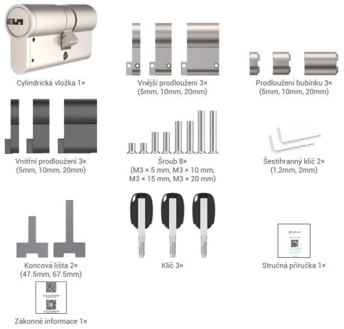 Cylindrická vložka s prestupovou spojkou je kompatibilná so šikovným zámkom EZVIZ DL01S . Modulárne riešenie s nastaviteľnou dĺžkou je možné prispôsobiť väčšine dverí, vďaka až 16 možným rozmerom cylindrickej vložky. Odolná konštrukcia s mosadzným telom a nástavcami zo zinkovej zliatiny zabraňuje násilnému otvoreniu. Súčasťou balenia sú 3 kľúče .