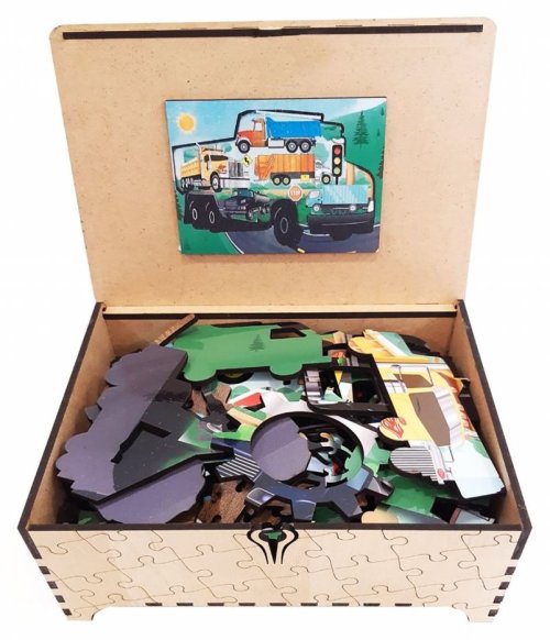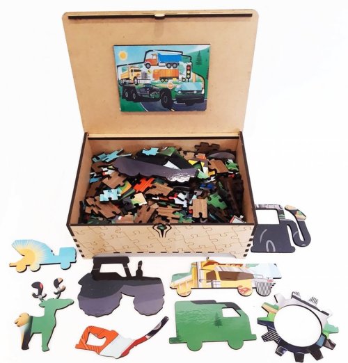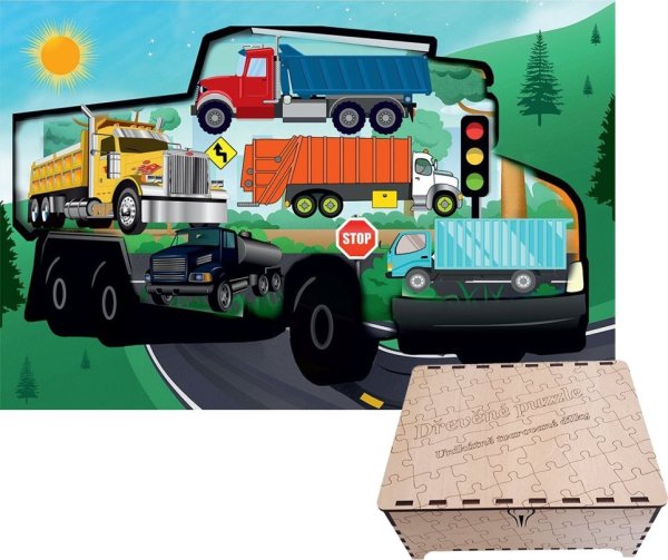 hladké hrany bez triesok a vysoká odolnosť vďaka precíznemu laserovému spracovaniu unikátne tvarované dieliky, časť dielikov je napr. v tvare náklaniach áut, vozidiel, vecí i benzínovej pumpy na papieri najvyššej kvality s garanciou ostrosti a sýtosti farieb as povrchovou lamináciou proti vniknutiu vlhkosti a poškriabaniu predloha na vnútornej strane veka dieliky sú uschované v prírodnej darčekovej krabičke skvelý darček pre dospelých alebo väčšie deti
