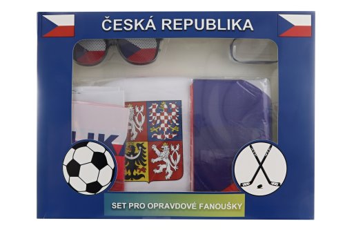 Fandiaca sada Česká republika pre skutočného fanúšika. Sada obsahuje klasický klobúk, náramok, vlajku o veľkosti 90x150cm, okuliare, pár nafukovacích tyčí a šál o veľkosti 15 * 135cm.